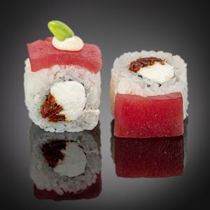 Рис, нори, тунец, вяленые томаты, бобы эдамаме, нежный сливочный сыр.