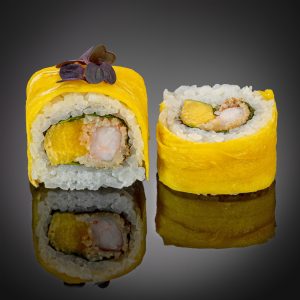 Рис, авокадо, имитация снежного краба, сливочный сыр, украшен икрой тобико. В комплект входит: соевый соус, васаби, имбирь, палочки.
