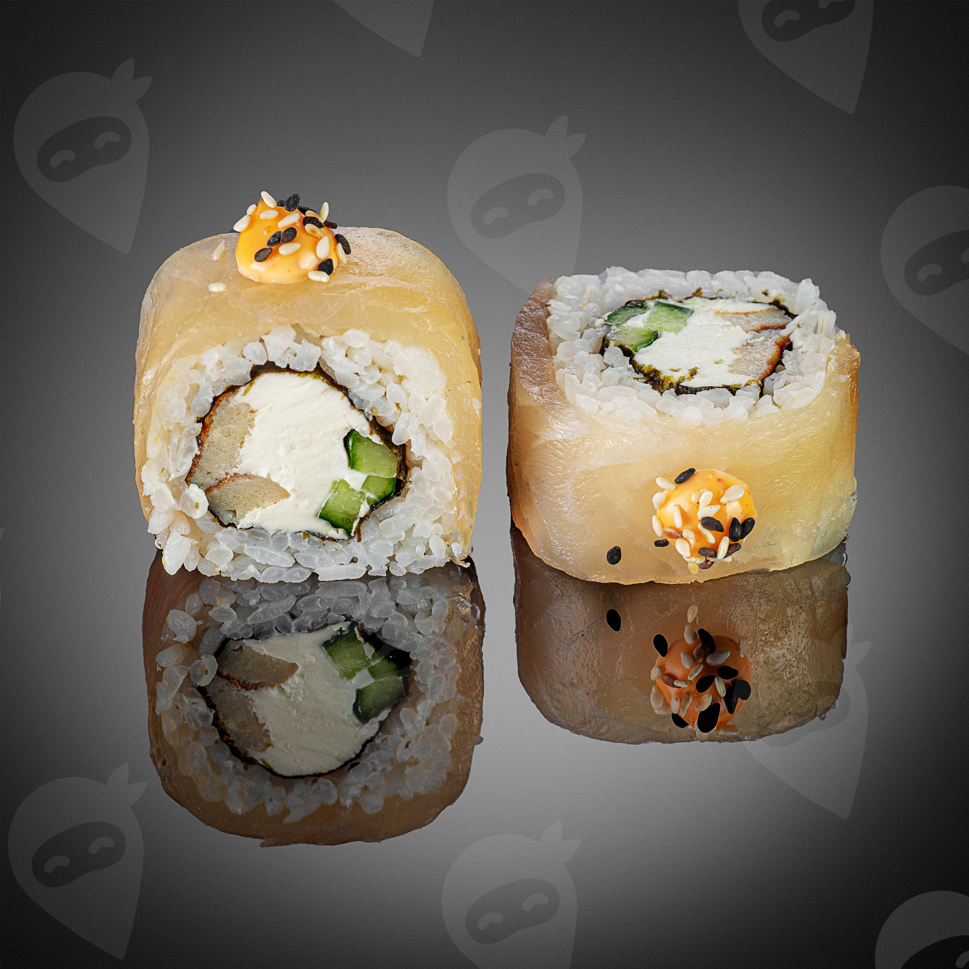 Рис, нежный сливочный сыр, свежий огурчик, филе лосося слабой соли. В комплект входит: соевый соус, васаби, имбирь, палочки.