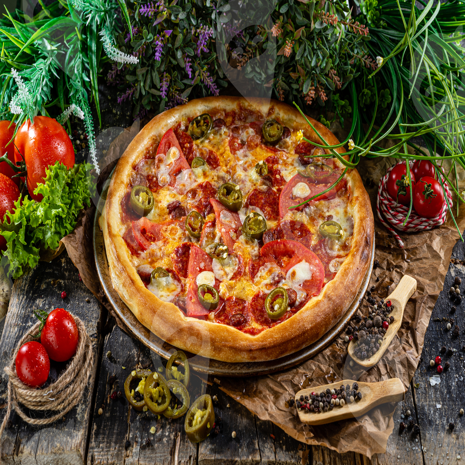 Пицца для тех, кто любит пожар!Авторский томатный соус, охотничьи колбаски, пепперони, помидоры, острый перец халапеньо, сыр моцарелла.