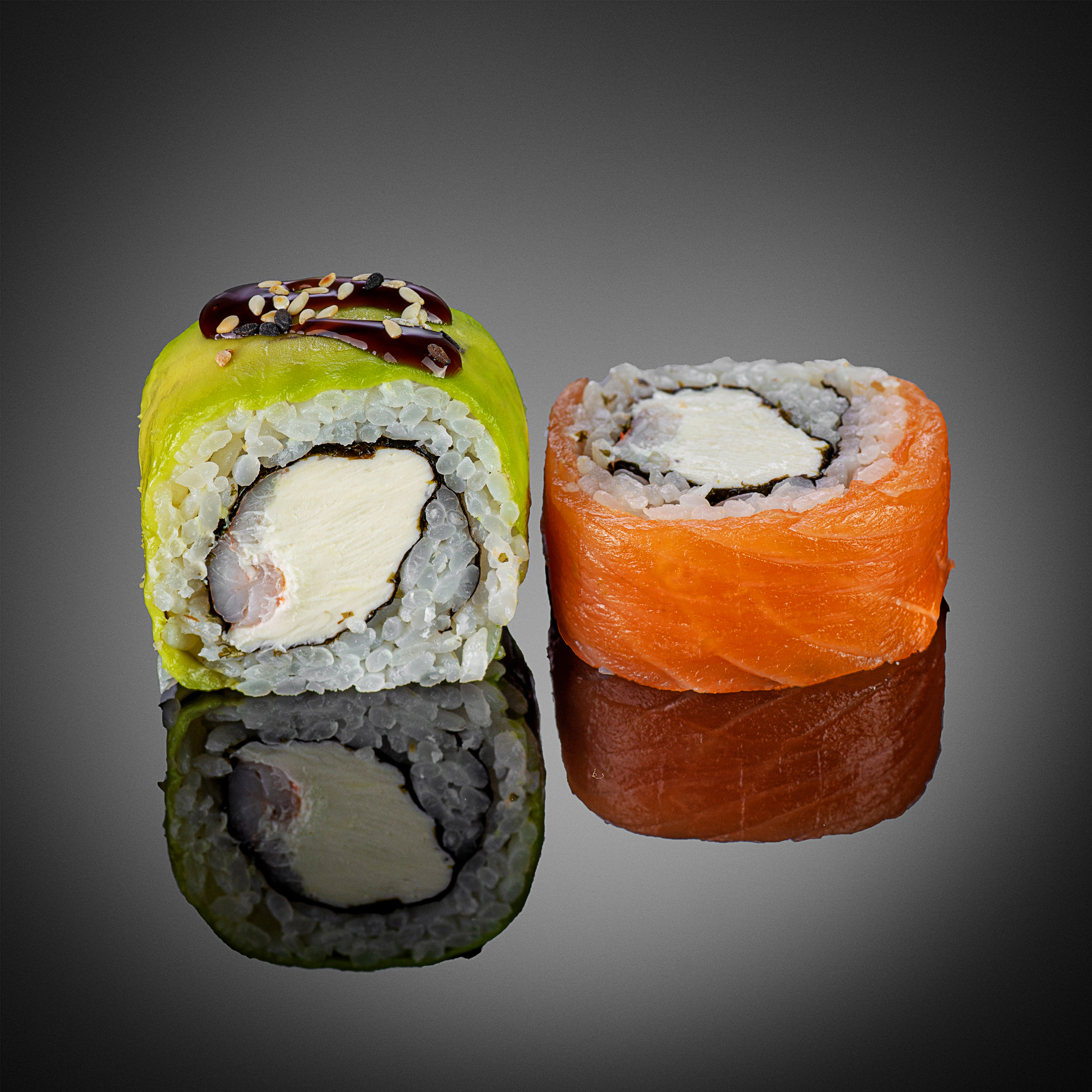 Ролл покрыт филе лосося и ломтиками авокадо с начинкой из тигровых креветок, сливочного сыра, поливается соусом унаги и посыпается кунжутом. В комплект входит: соевый соус, васаби, имбирь, палочки.