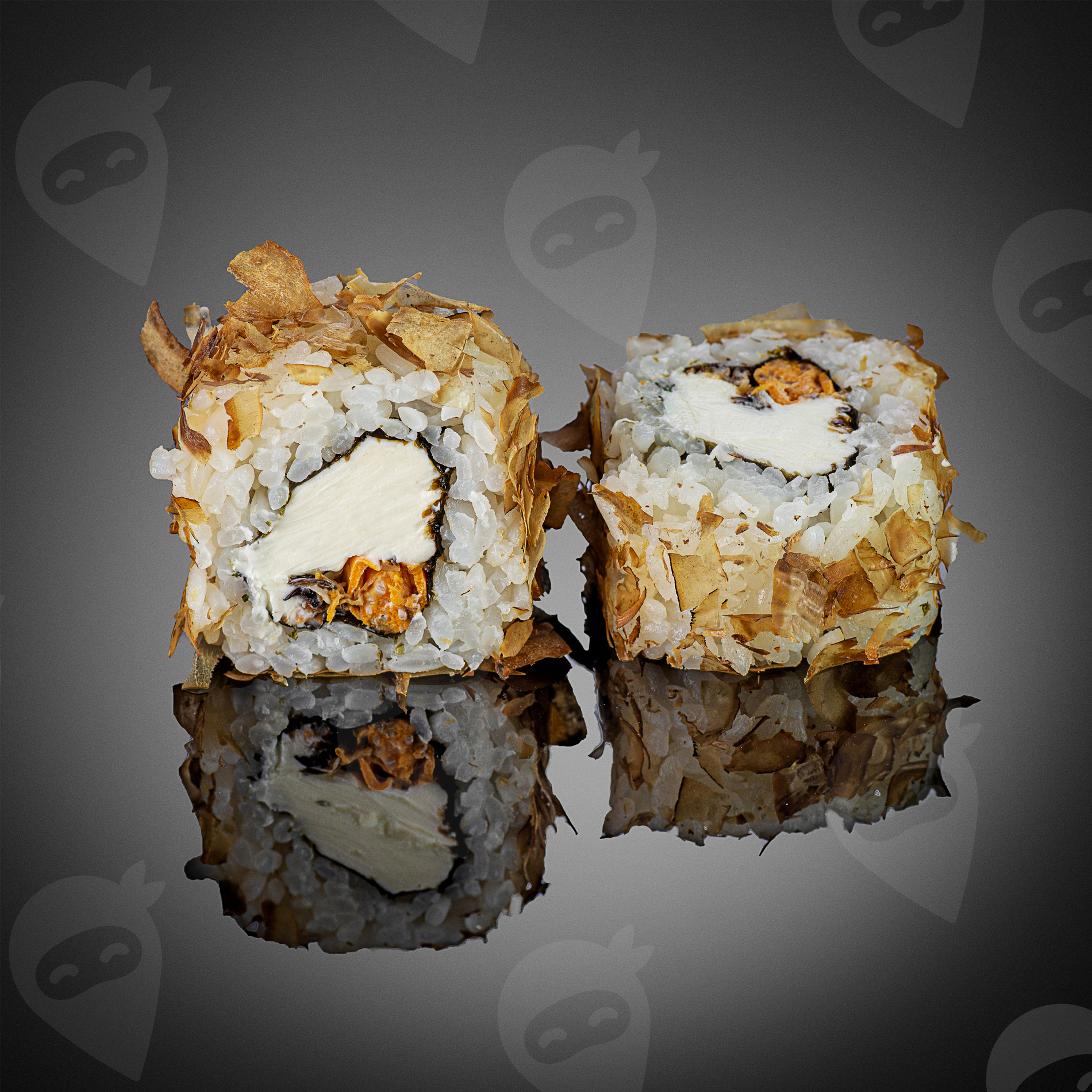 Рис, стружка тунца, мидии, сливочный сыр. В комплект входит: соевый соус, васаби, имбирь, палочки.